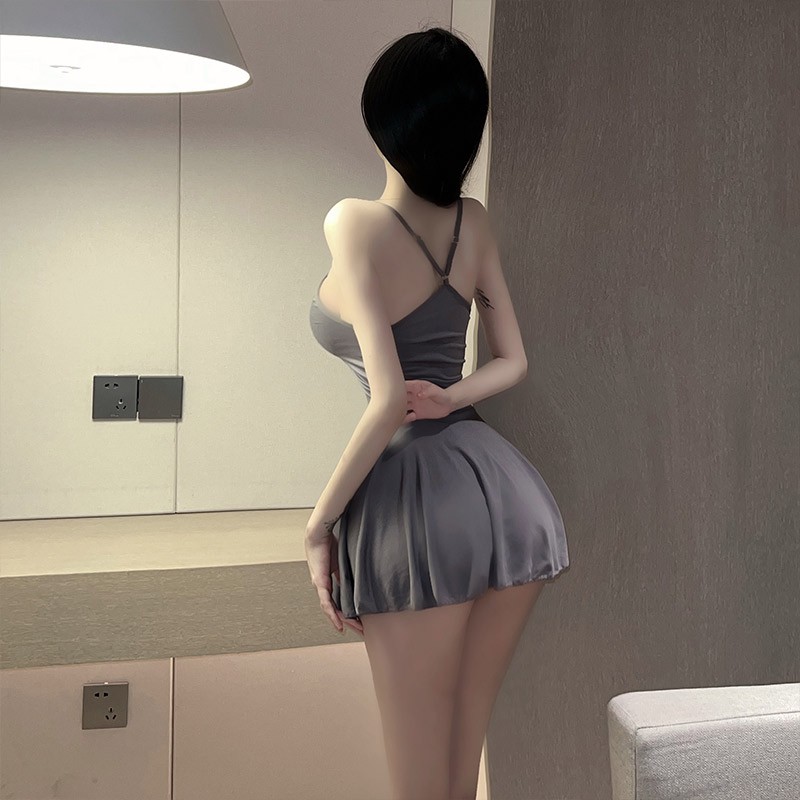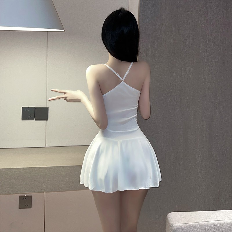 女诱惑学院风百褶裙透视开档免脱抹胸挂脖JK情趣用品性感学姐淑女制服裙丁字裤短裙套装W9951