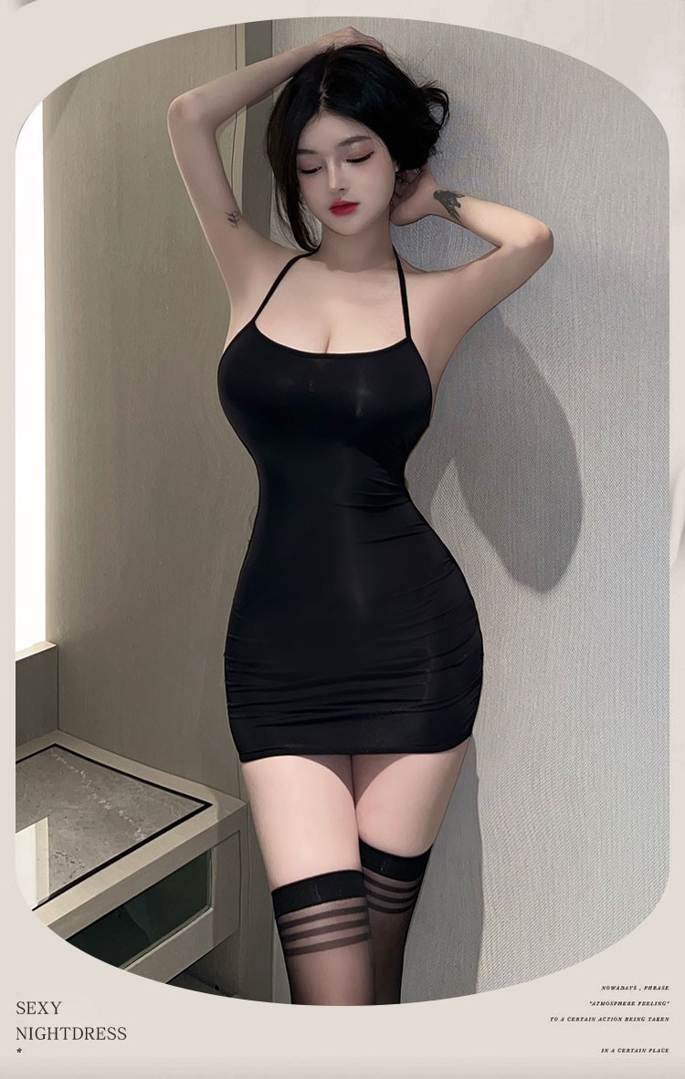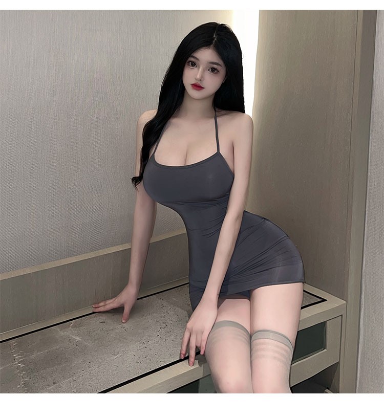 情趣内衣 性感睡衣女极污度诱惑挂脖连衣裙夫妻刺激丁字裤房事套装夜店变态战袍 美背系带长裙 灰 B9806