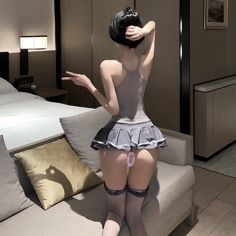 女诱惑学院风百褶裙透视开档免脱抹胸挂脖JK情趣用品性感学姐淑女制服裙丁字裤短裙套装W9951