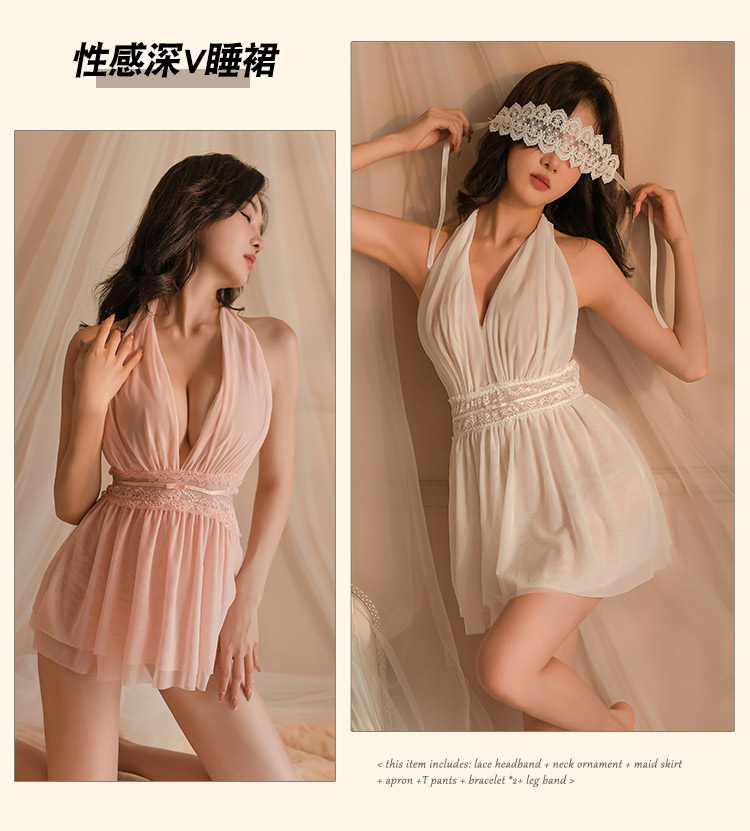 倾城鸟 情趣内衣性感睡衣女制服诱惑套装sm角色扮演深v露背透视网纱吊带裙开档免脱丁字裤挂脖家居服H9978